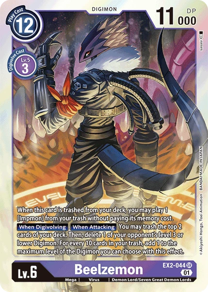 When this card is trashed from your deck, you may play 1 [Impmon] from your trash without paying its memory cost.[When Digivolving][When Attacking] You may trash the top 2 cards of your deck. Then, delete 1 of your opponent’s level 3 or lower Digimon. For every 10 cards in your trash, add 1 to the maximum level of the Digimon you can choose with this effect.