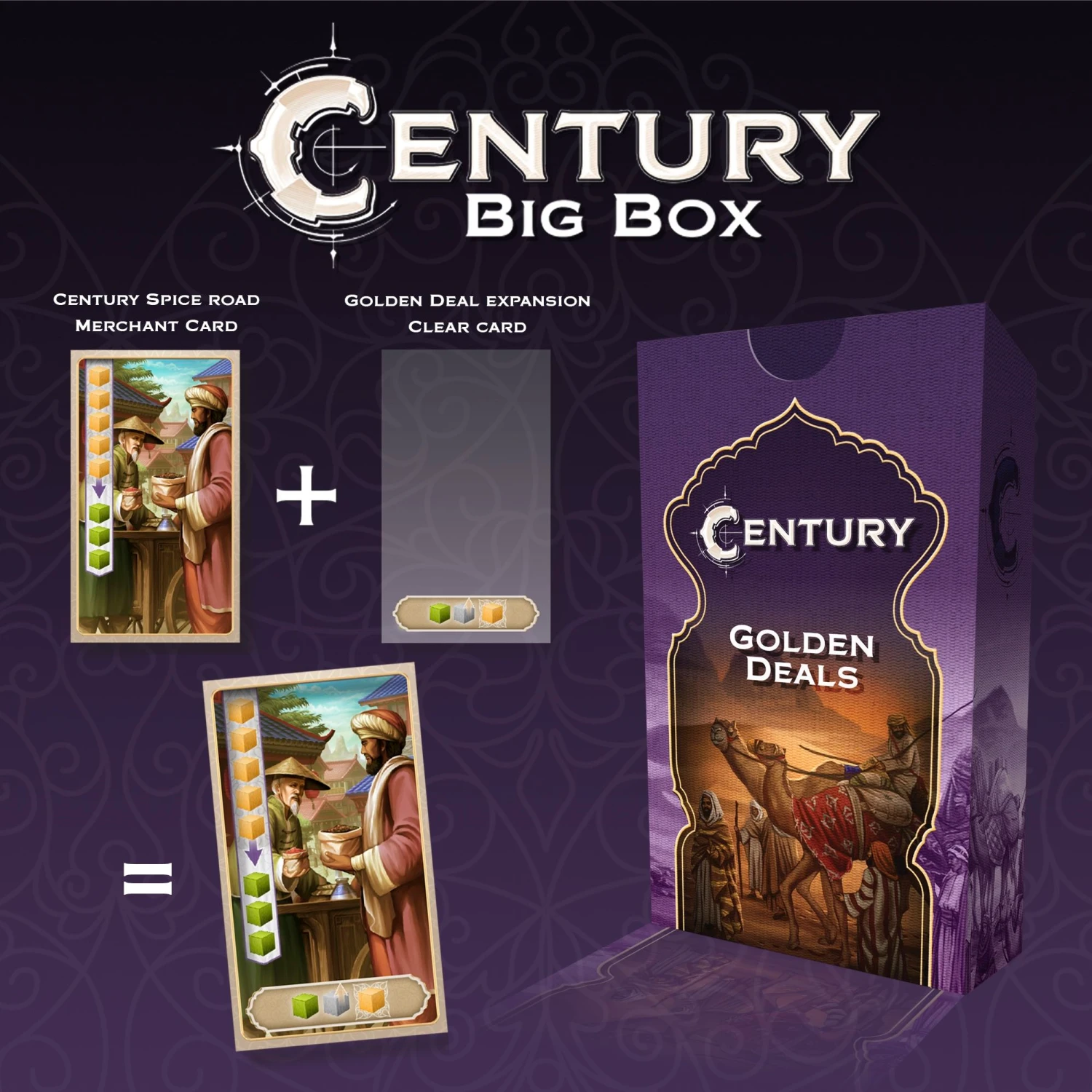 Century Big Box contains the three titles in the Century game series — Spice Road, Eastern Wonders, and A New World — along with all promo items released for these games and a new mini-expansion, Golden Deals.