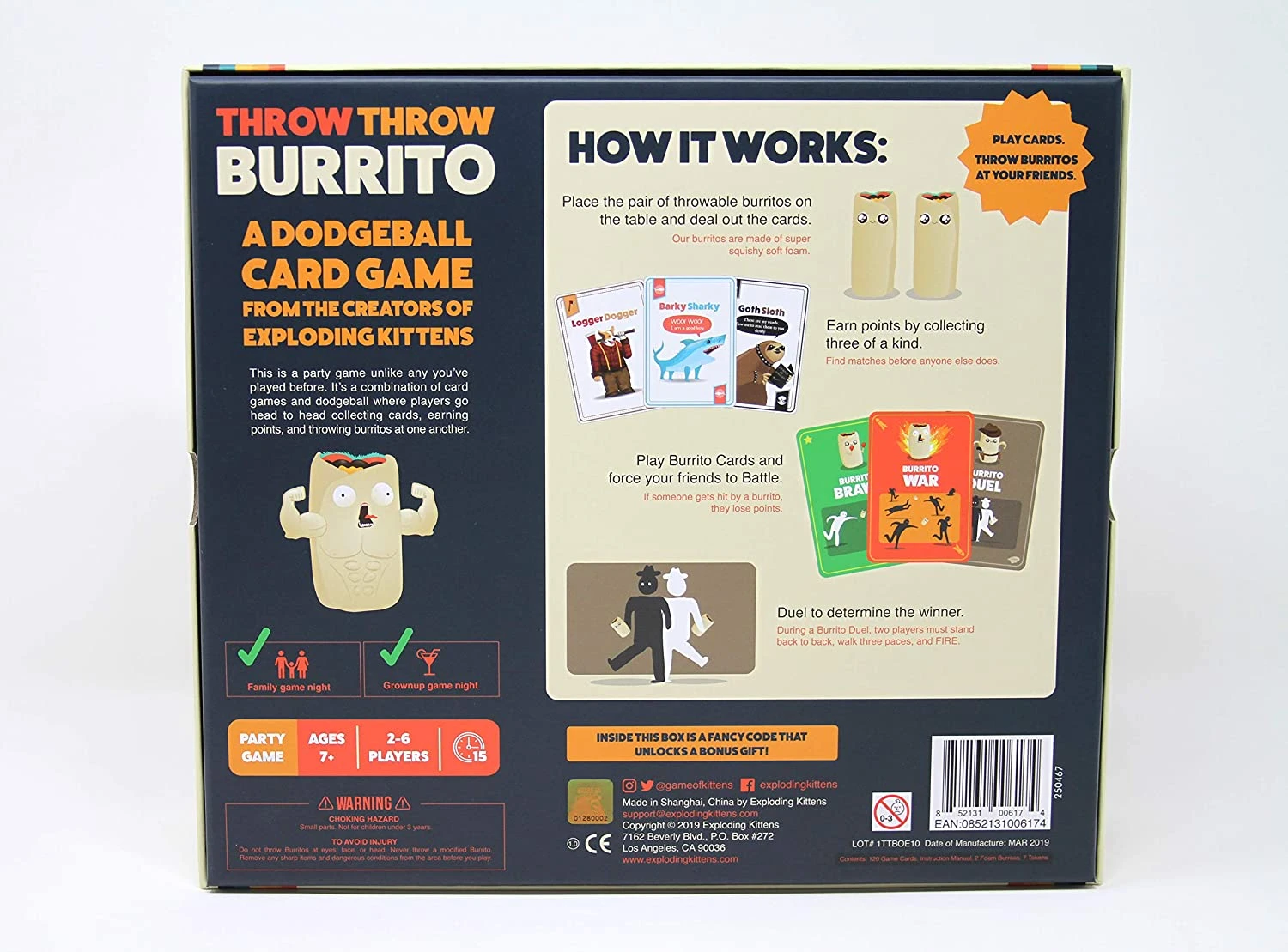 - Try to collect matching sets of cards faster than your opponents while simultaneously ducking, dodging, and throwing squishy airborne burritos